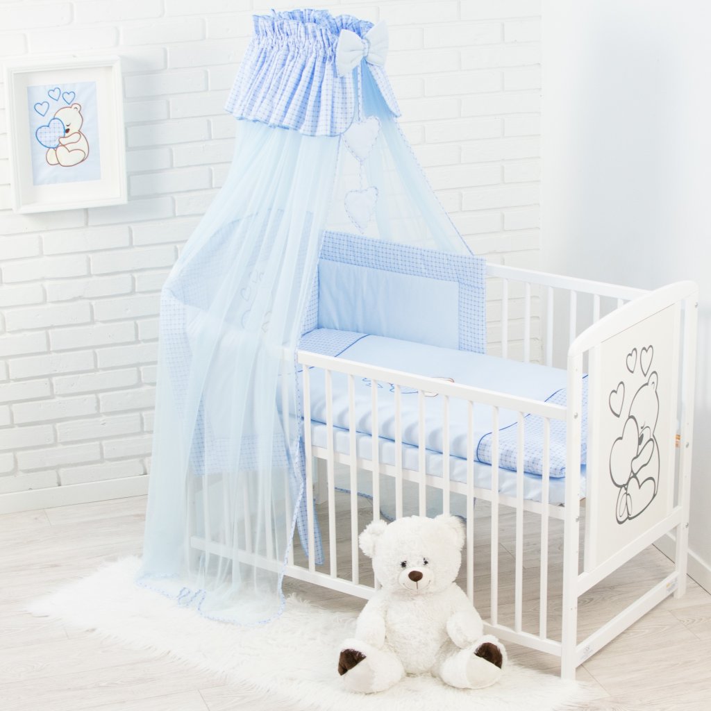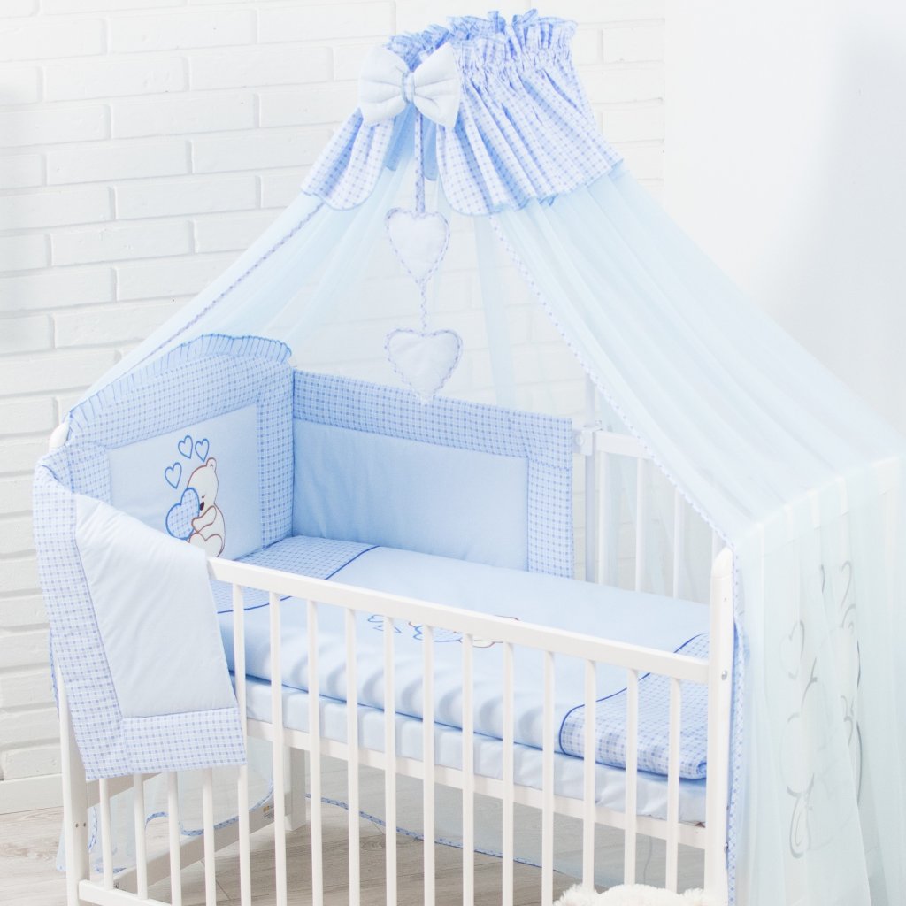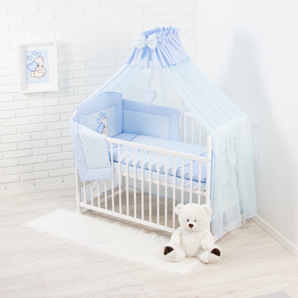 10 dílná vyšívaná souprava + baldachýn + lůžkovina MODRÝ MEDVÍDEK SRDCE