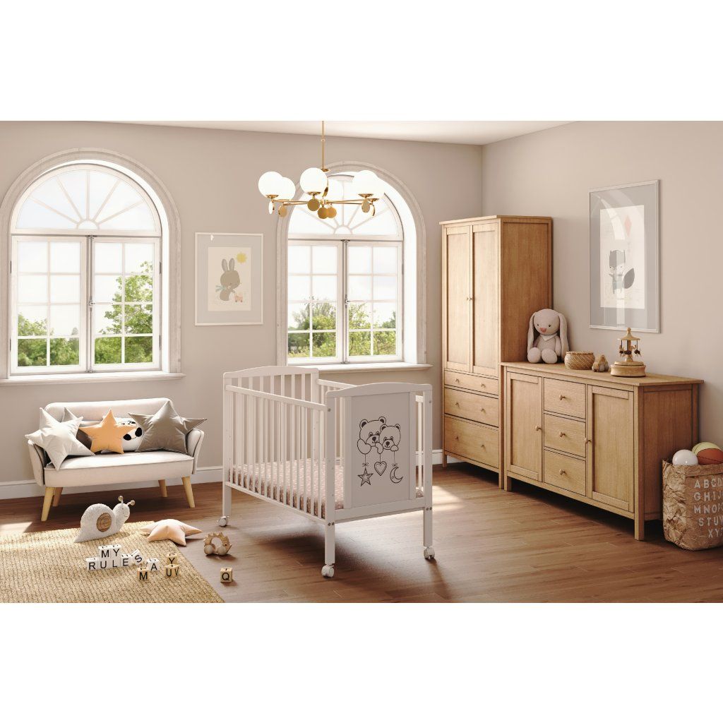 Model Dva medvídci spojuje funkční postýlku s roztomilým dekorativním prvkem, který od prvních dnů vytváří příjemné a bezpečné prostředí pro dítě.